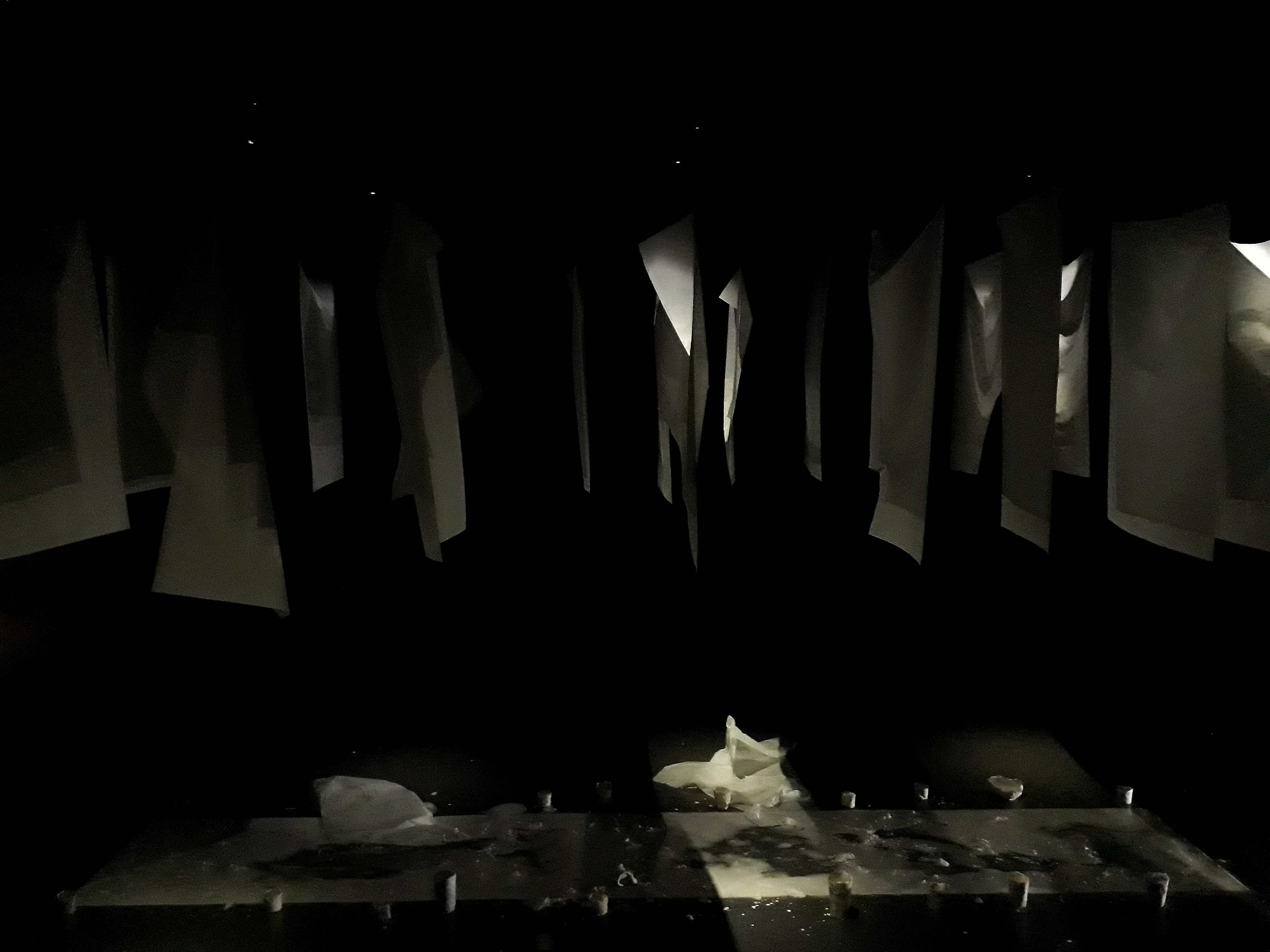 Cette expérience m’a permis d’être au plus près de la matière et de m’en emparer au travers de mon corps entier. Les réactions de la fécule et du papier, leur manière de bouger, de résonner, de passer d’un état à un autre ou encore de sonner, ont influencé mes gestes et mouvements. Je me suis confrontées aux éxigences de ces matières, à leurs caratères aléatoire et imprévisible. Cela a façonné ma vision de la scénographie et de ma démarche artistique actuelle.