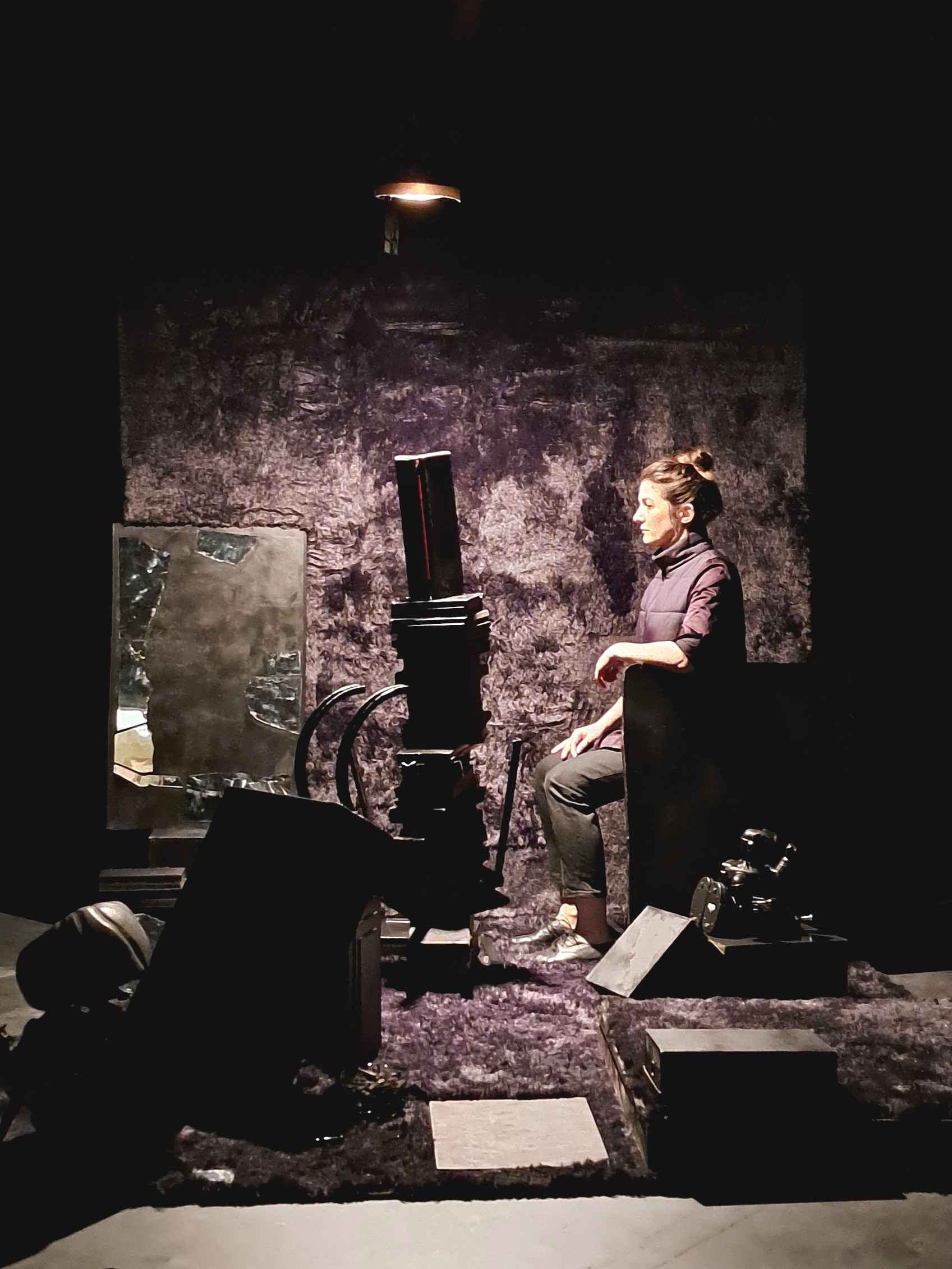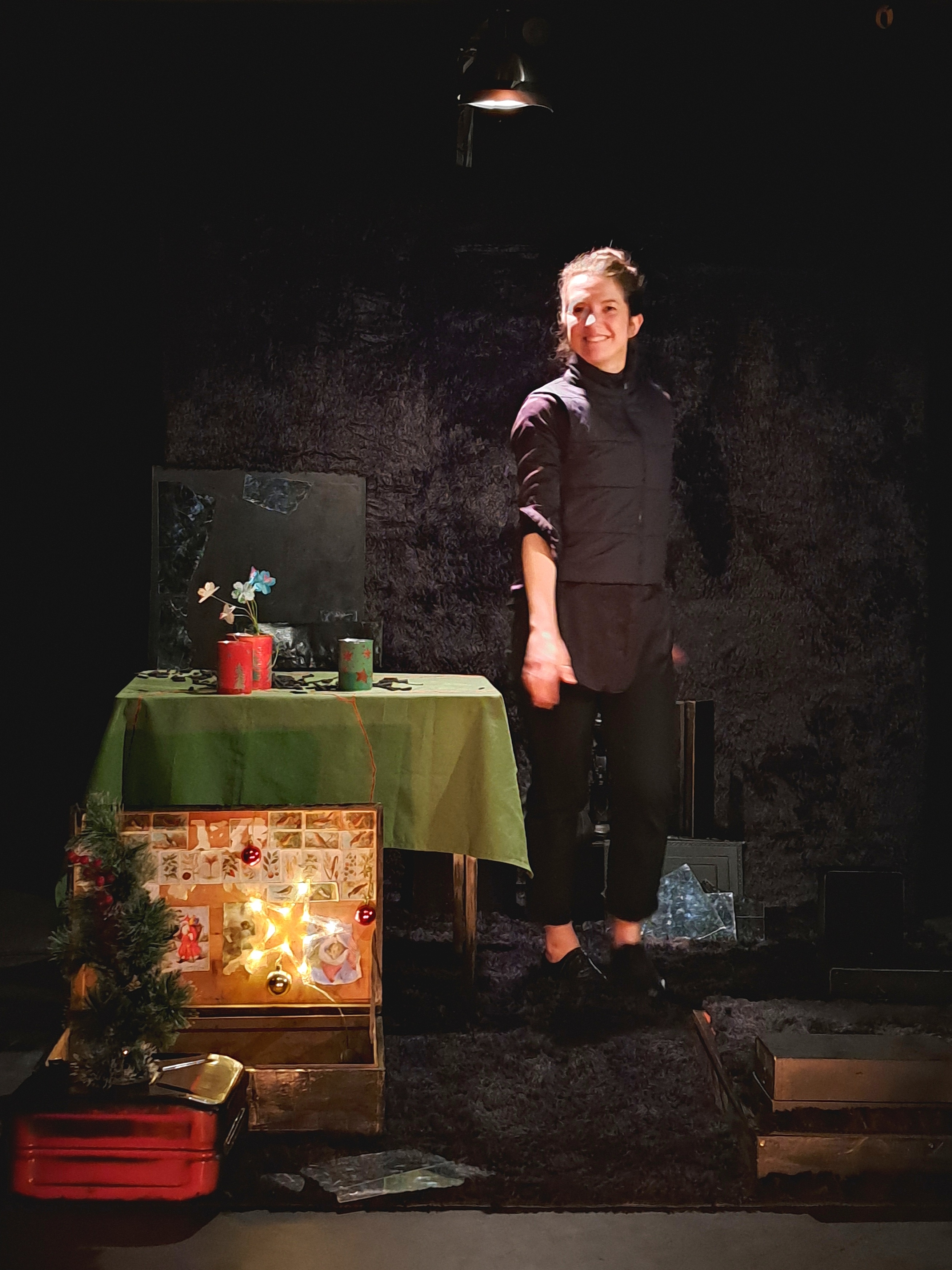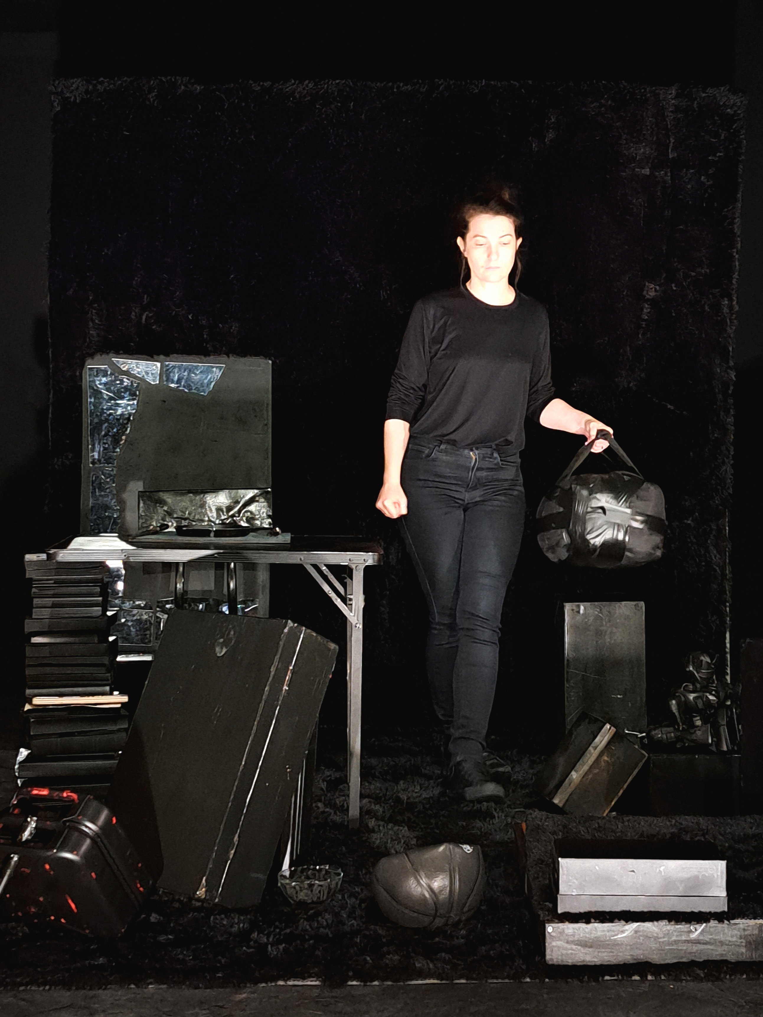 Un espace de deux mètres par deux pour une création tout terrain. Au milieu d’une salle de classe ou de la scène d’un théâtre, un sol et un mur en épaisse fourrure délimitent le plateau de jeu. Des objets s’y amoncellent, prêt à vaciller ou bien à être détourné. Les piles de livres deviennent pied de tables tandis que les nombreuses malles deviennent étagère à souvenirs. L’espace prend vie et couleurs, s’aère au fur et à mesure que le personnage se réconcilie avec elle-même et reconstruit son espace.DISTRIBUTION